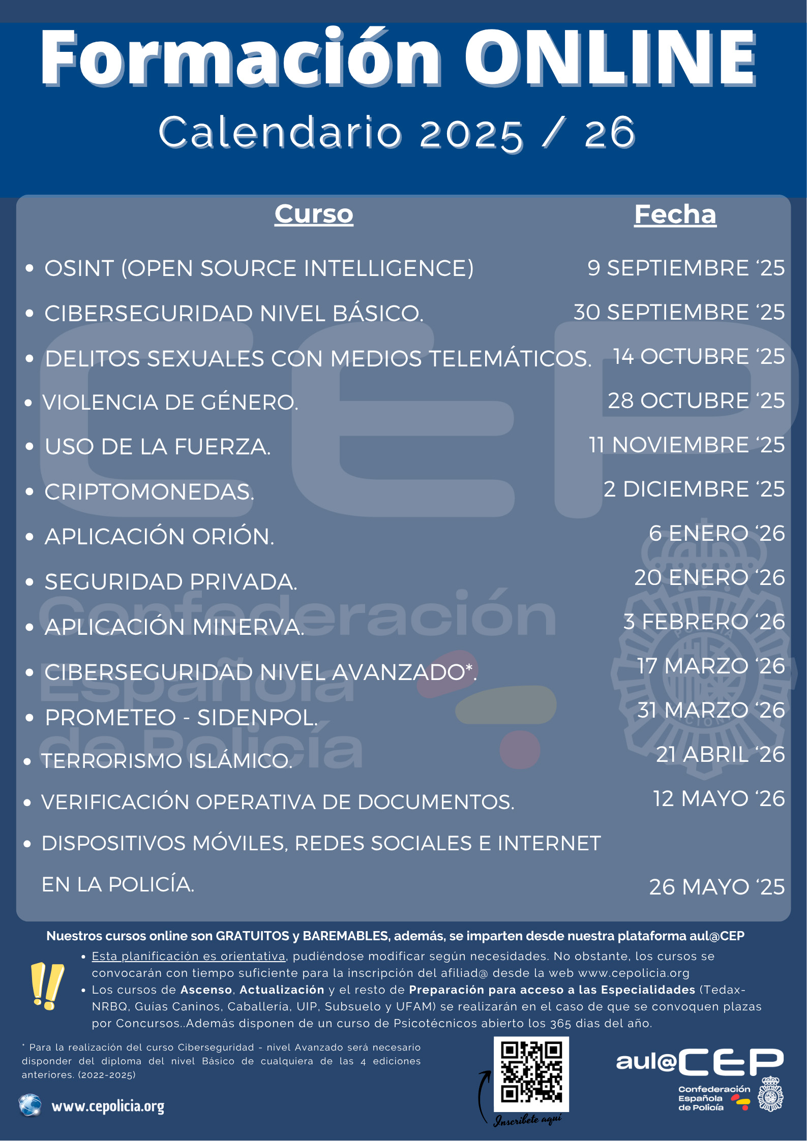 Calendario Formativo para el curso 2025/26, una oportunidad única para formarte online, de manera gratuita y con cursos baremables, adaptados a las necesidades reales de los profesionales de la seguridad y solo para afiliados CEP.