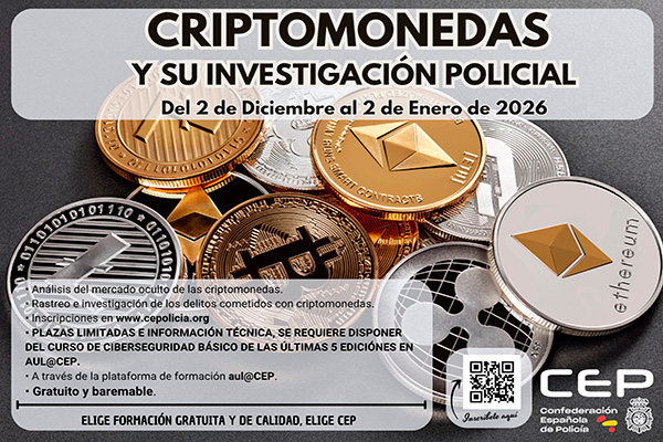 Del 2 de Diciembre al 2 de Enero de 2026 inclusive comenzará un nuevo curso en Aul@CEP, "Criptomonedas y su investigación policial" que profundizará en el concepto, definición e investigación de los delitos cometidos con criptodivisas y sus derivados.
