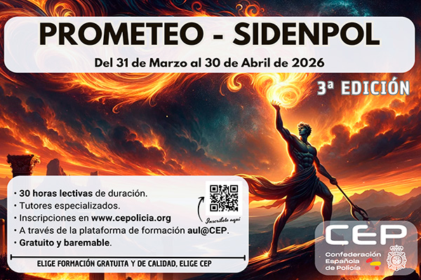 Descripción: Tercera edición de la capacitación en investigación sobre las herramientas PROMETEO y SIDENPOL. Único curso para la optimización de la tramitación y consulta de atestados policiales. Con CEP, siempre la mejor formación policial de España (cursos mensuales de especialización, acceso y ascenso). Requisitos y matriculación: • Inscripciones: www.cepolicia.net o a través del QR del cartel. • Cierre de inscripciones: 29 de marzo de 2026. • Enlace de afiliación: Afiliarse a CEP• No se admitirán inscripciones fuera de plazo ni una vez comenzado el curso.